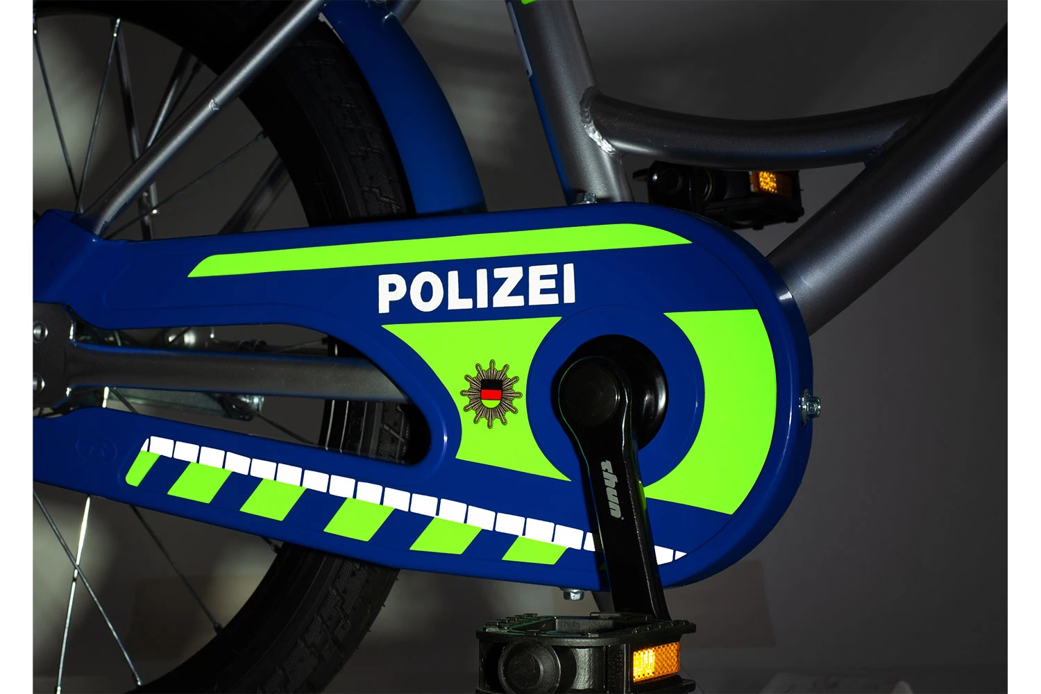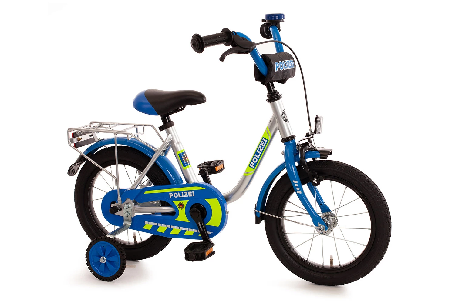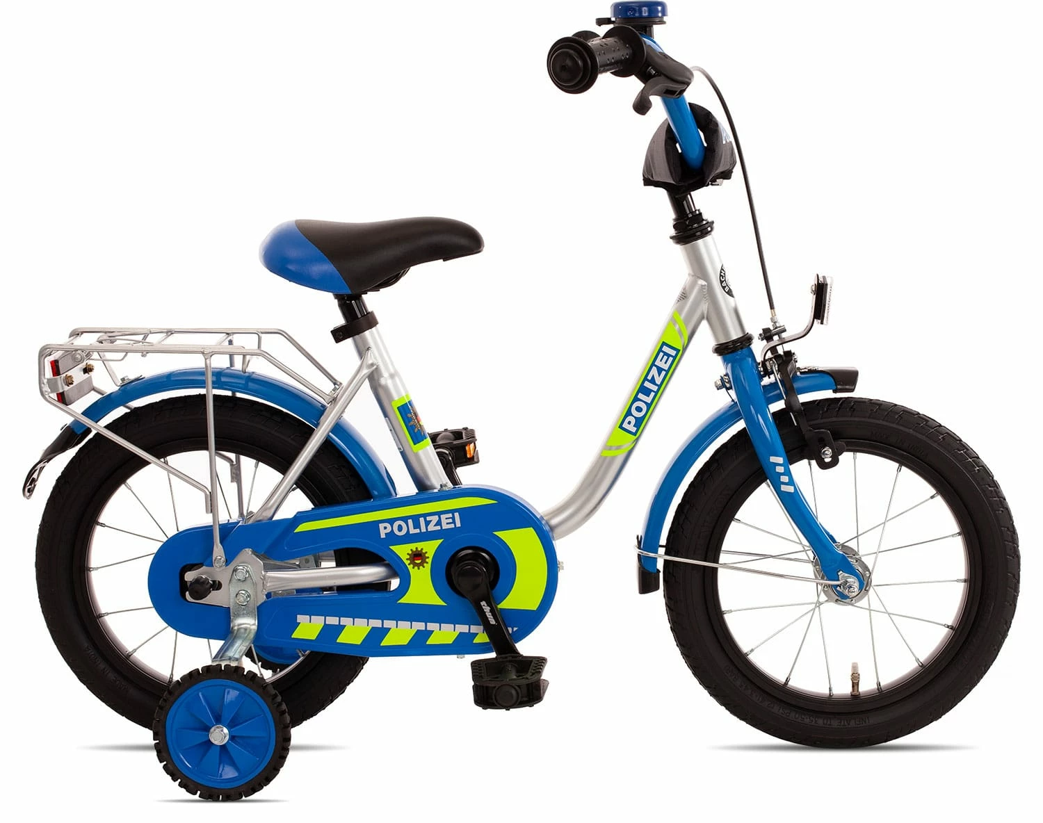 Das Bachtenkirch Polizei Kinderfahrrad, hier in der Version mit 14 Zoll Laufrädern, kommt im original Polizei-Design angefahren.